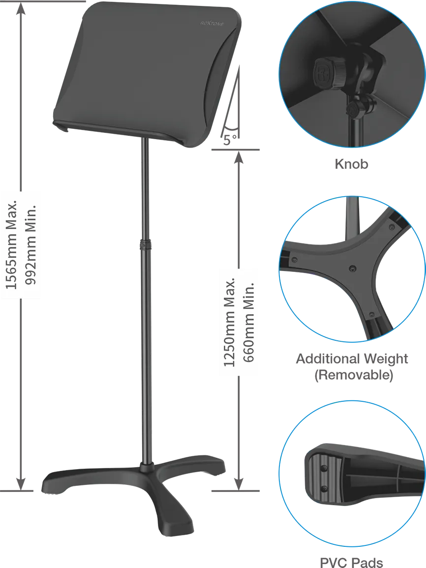 • Operação com uma mão para ajuste de altura e rotação do suporte de música.